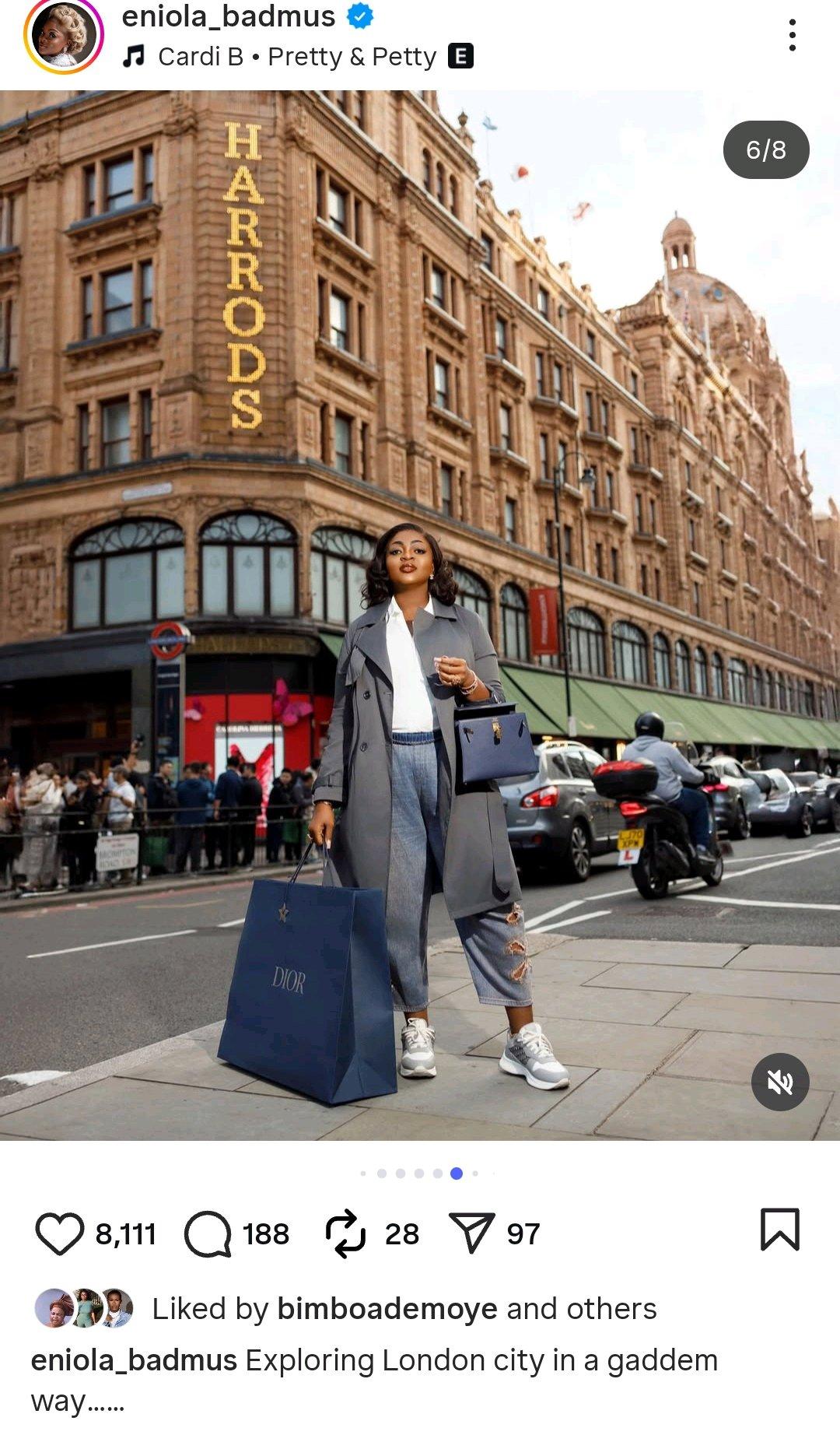 Popular Nollywood actress and media personality, Eniola Badmus (@eniola_badmus), has set social media abuzz with her stunning new photos from the streets of London, where she showcased her signature confidence, class, and elegance.