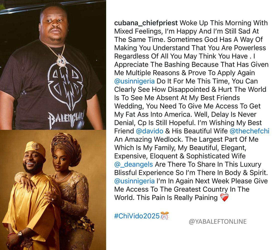 "Please give me access to the greatest country in the world" – Cubana Chief Priest begs the US following his unavoidable absence from Davido's wedding in Miami.