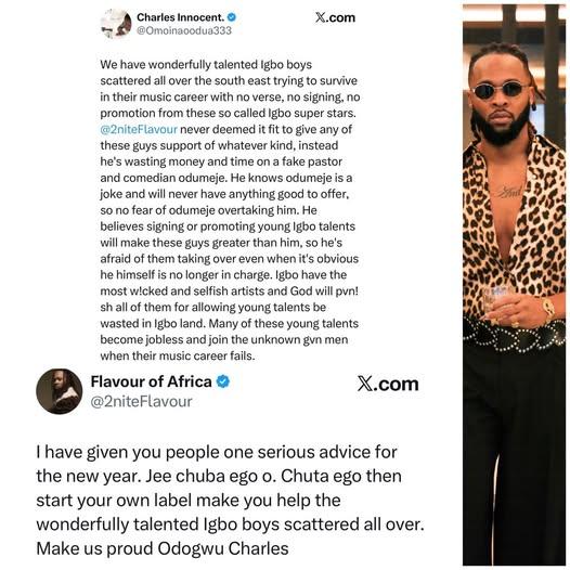 Flavour Responds to X User Who Accused Him of Refusing to Sign Young Igbo Singers Out of Fear of Being Replaced