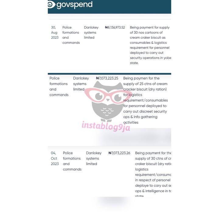 A review of the federal payments portal, Govspend, shows the Nigerian Police Force (NPF) spent N22.282 million on 85 cartons of Cream Crackers biscuits during 2023 operations.