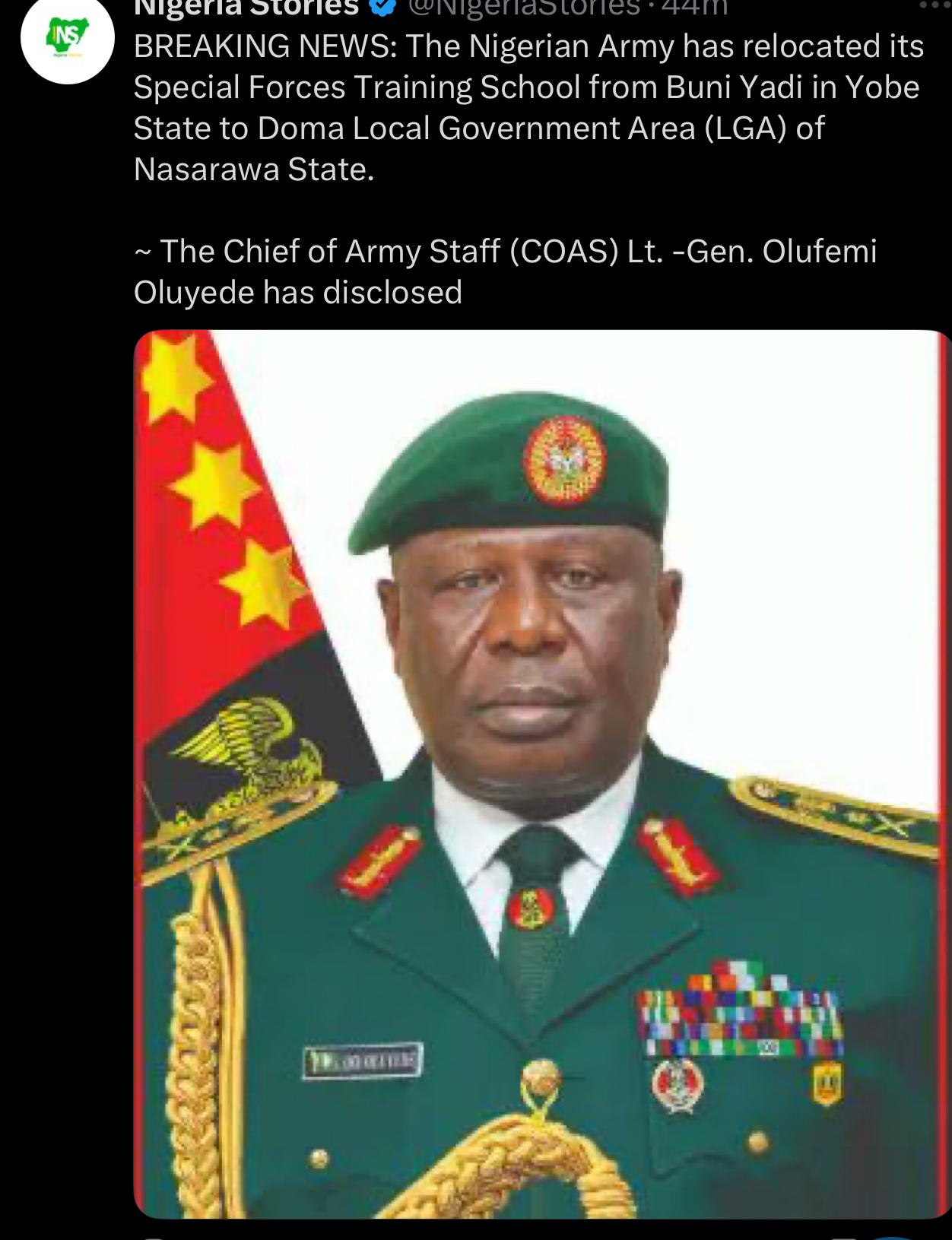 BREAKING NEWS: The Nigerian Army has relocated its Special Forces Training School from Buni Yadi in Yobe State to Doma Local Government Area (LGA) of Nasarawa State. ~ The Chief of Army Staff (COAS) Lt. -Gen. Olufemi Oluyede has disclosed