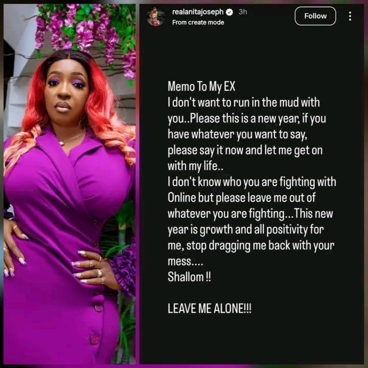 “Memo to my EX… I don't want to run in the mud with you. Please this is a new year, if you have whatever you want to say, please say it now and let me get on with my life… This new year is growth and all positivity for me. Stop dragging me back with your mess… LEAVE ME ALONE!!!”