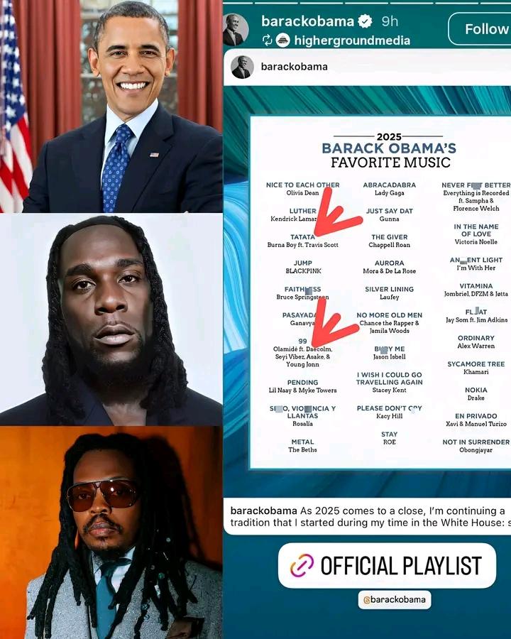 JUSTIN‼️Olamide’s “99” and Burna Boy’s “Tatåta” Make Barack Obama’s Favorite Songs of the Year 2025 Playlist. Nigerian music continues to shine on the global stage as Olamide’s “99” and Burna Boy’s “Tatåta” have eårned sp0ts on former U.S. President Barack Obama’s highly anticipated Favorite Songs of the Year 2025 playlist. The annual playlist, which celebrates outstanding music from around the world, is known for sp0tlighting songs that made cultural impact throughout the year. The inclusi0n of Olamide and Burna Boy further reinf0rces the growing influençe of Afrobeåts and Nigerian artists on the international music sçene. Fans have tåken to social media to celebrate the milest0ne, describing it as another major win for Nigerian music. With this recognition, Olamide and Burna Boy j0in a gl0bal list of artists wh0se work res0nated bey0nd b0rders in 2025, mårking yet another proud moment for Africa’s £ver ev0lving s0und.